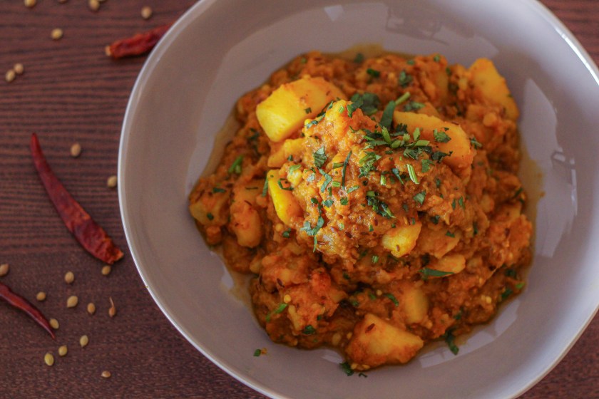 A simple and easy recipe for Aloo Baingan Masala. You’ll need potatoes, eggplant, onion, tomatoes and spices. Relish it with some hot phulkas.