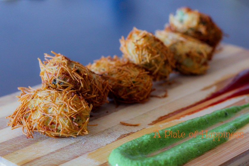 Crispy bites are a snack or a starter recipe. To make these delicious bites we take boiled potatoes, paneer (Indian Cottage Cheese) & spices, mix them well, then make desired shape cutlets out of the mix and finally roll them up in vermicelli before deep frying.
