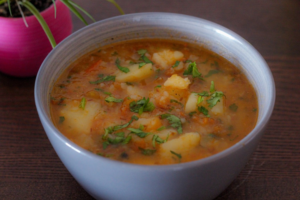 6. Once pressure settles down open the lid and mash the potatoes a little. Add coriander leaves and mix. Your Saatvik Aloo Tamatar is ready.