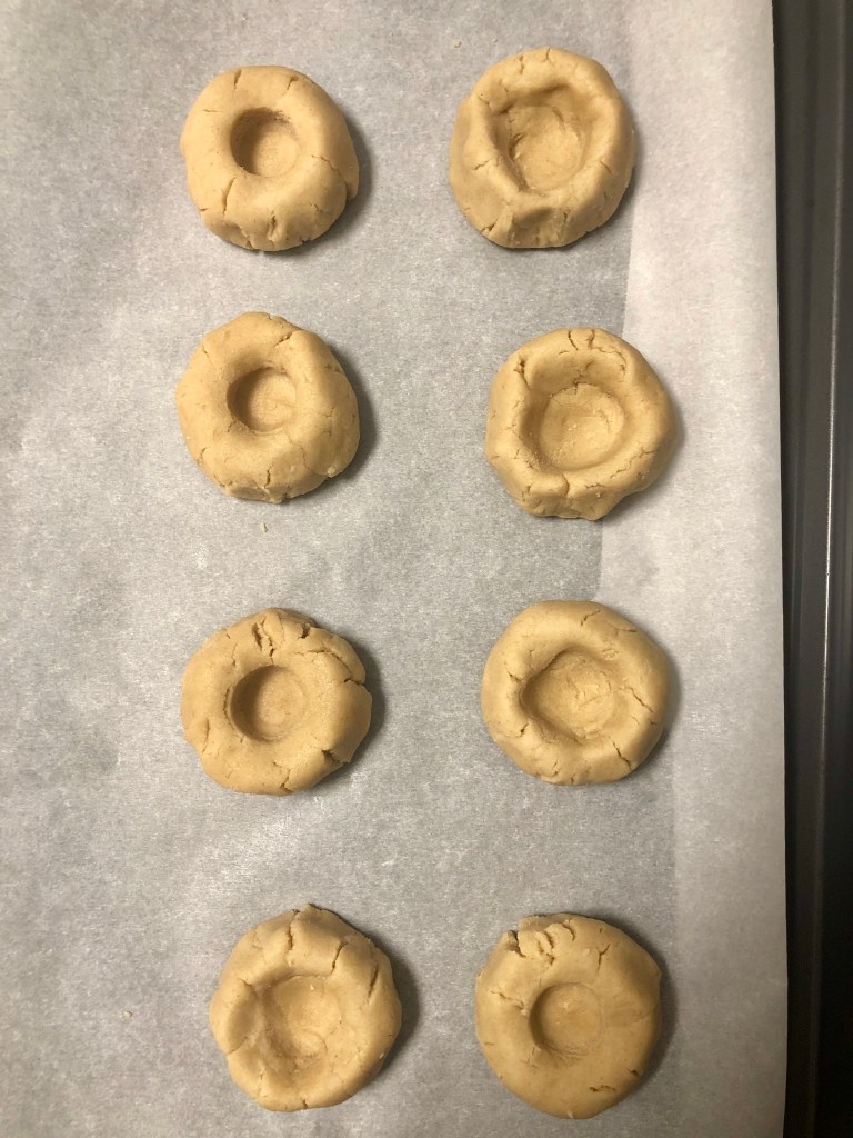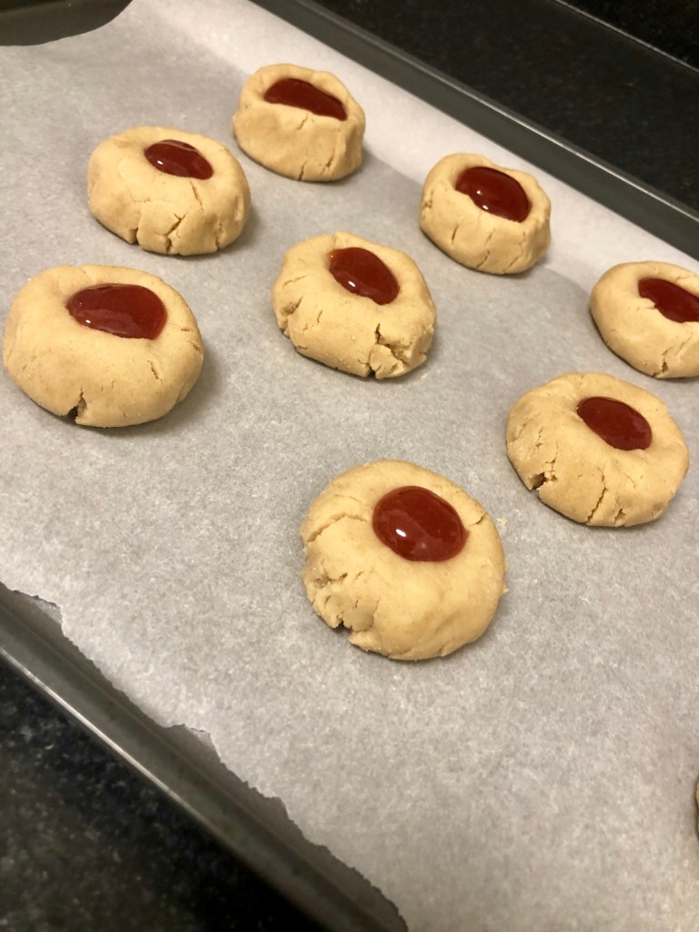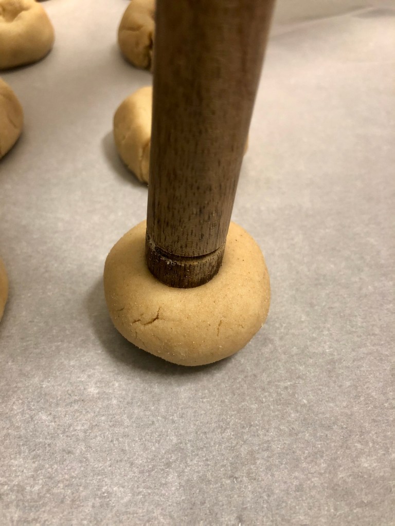 - Press the centre of each ball with your finger or handle-end of a wooden spoon. Make a deep well. Fill the cookie centre with the jam using a small spoon (images below for your reference)