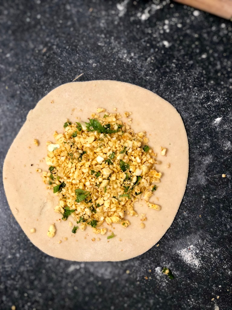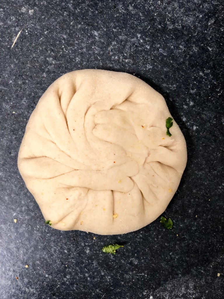 - Take a ball and dust it, start rolling it with a rolling-pin to make around 3 inches circle. Place some stuffing in the centre and bring the edges together to make a round stuffed ball. Roll it again to make a round kulcha