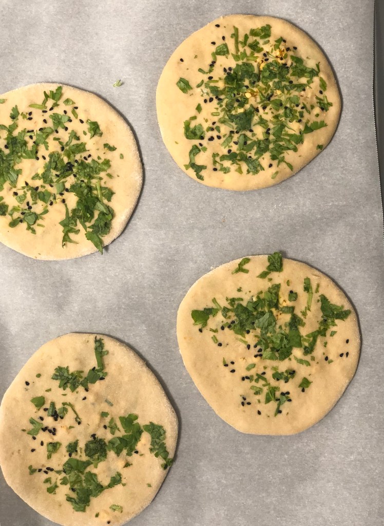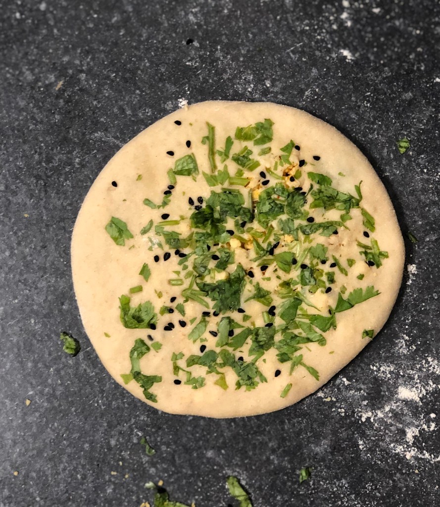 - Sprinkle some black cumin seeds and coriander leaves, gently roll a little bit again so that they stick to the kulcha