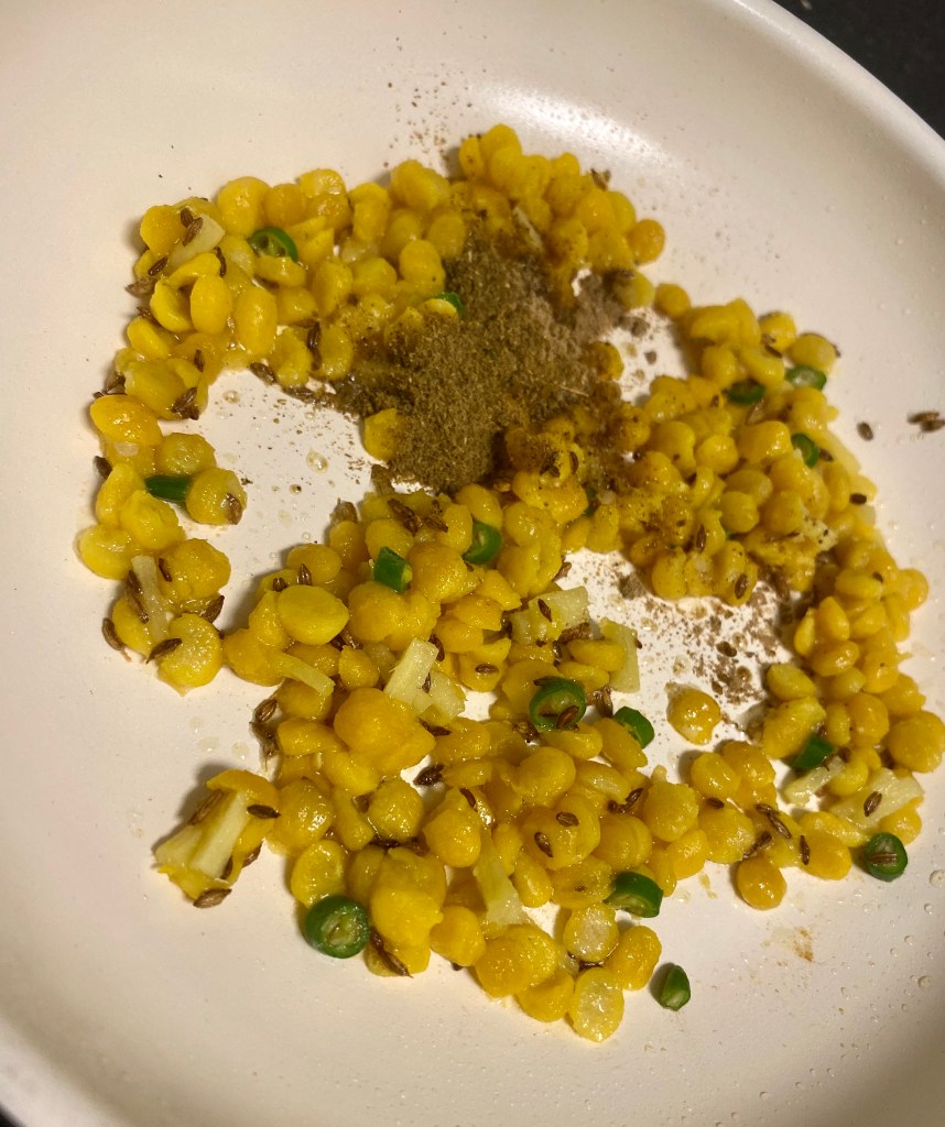 2. Heat 1 tsp oil in a pan, add cumin seeds and let it splutter. Add ginger and green chillies, saute for a few seconds. Add boiled chana dal, red chilli powder and salt. Mix and cook for 3-4 mins. Now add garam masala powder, chaat masala powder & coriander leaves and mix. Your stuffing is ready, keep aside