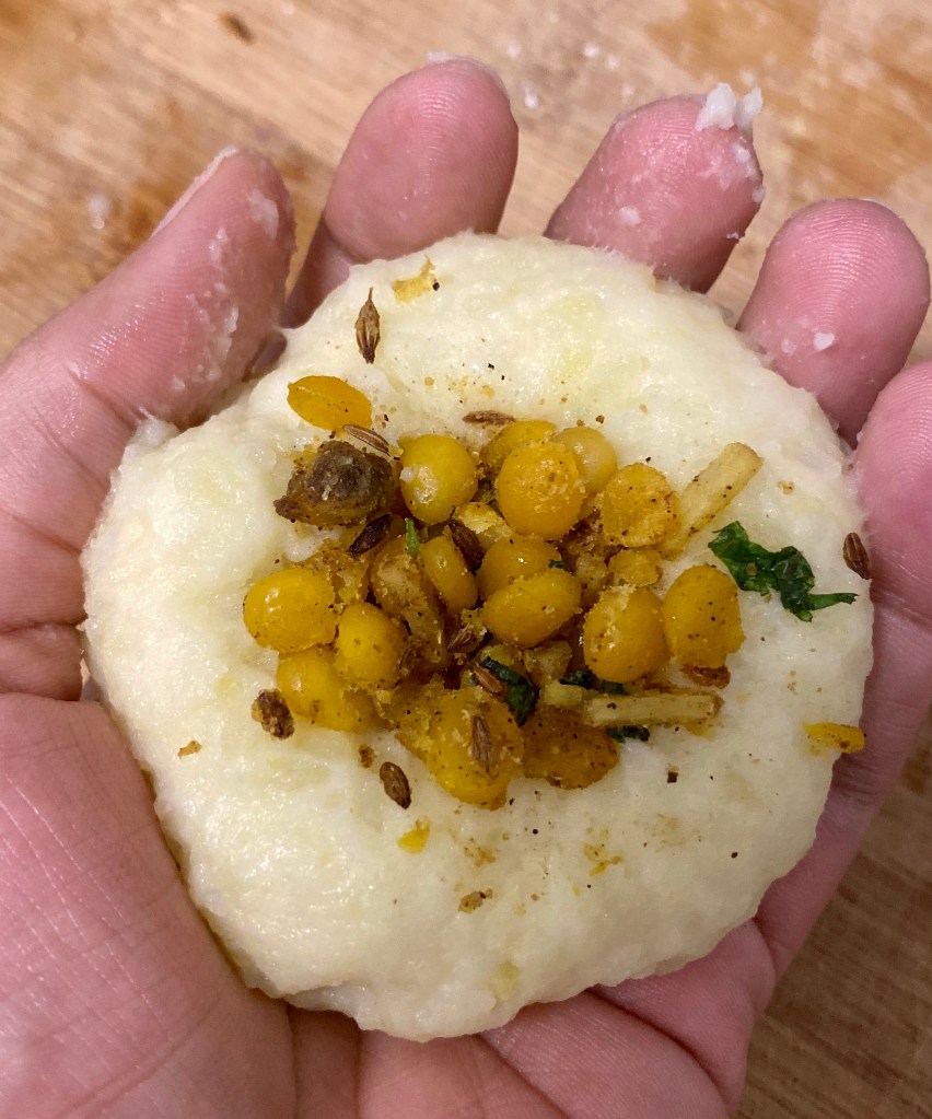 3. Add boiled potatoes to a mixing bowl, mash them nicely. Add soaked poha, corn flour and salt. Mix well, it’ll be sticky but doable. Divide the dough into 6 equal portions