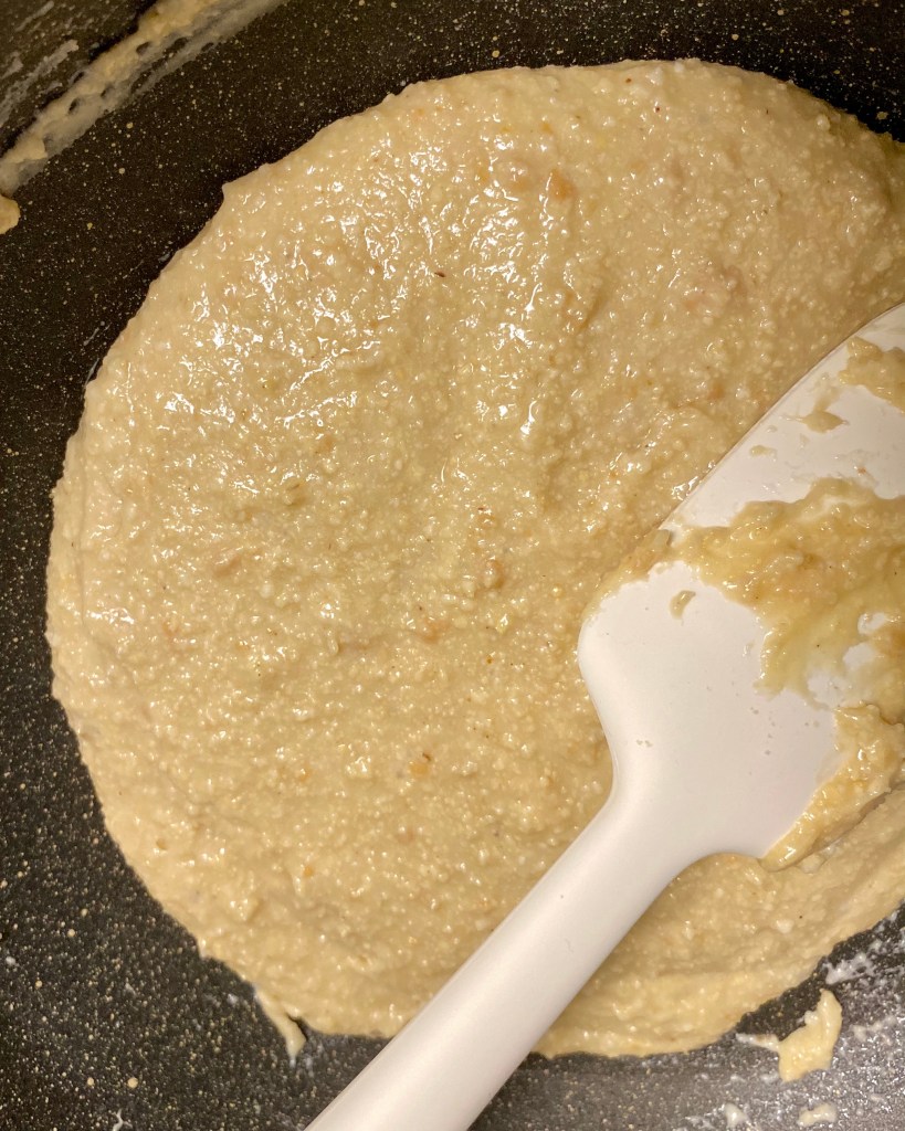 2. Add water and sugar in a pan, bring it to boil. Now turn the flame to low and add powdered cashews in portions so that no lumps are formed