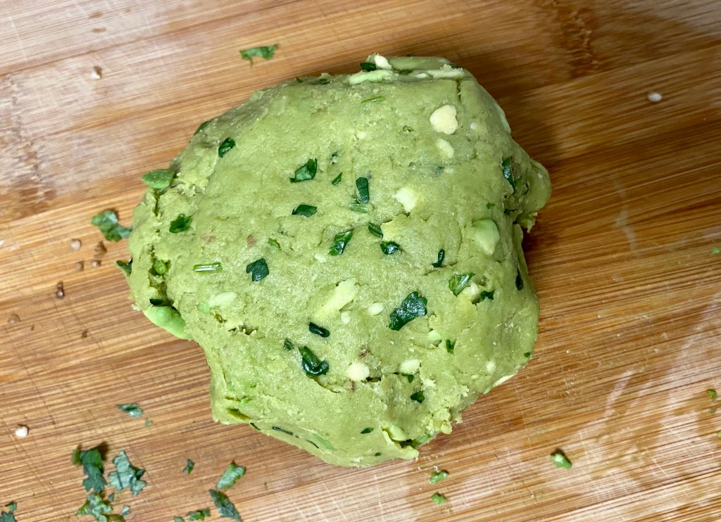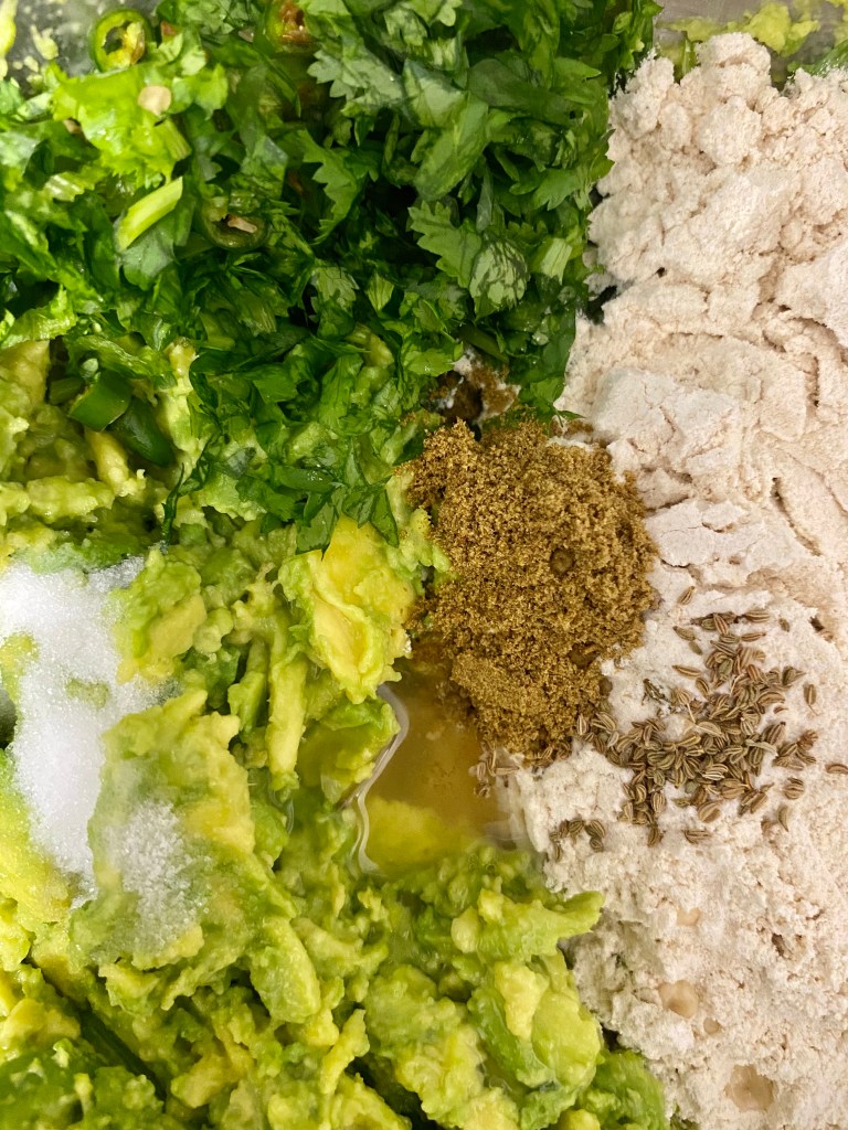 - Take a mixing bowl and add mashed avocado, coriander leaves, green chillies, lemon juice, salt, carrom seeds and cumin powder. Mix and start adding 1 cup wheat flour in portions. Knead to make a soft smooth dough, add more flour if it’s too sticky. Keep aside for 15 mins