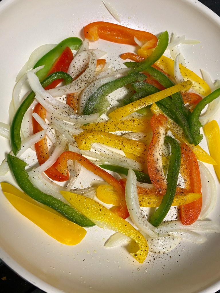 - Meanwhile heat 1 tsp oil in a pan. Add onion, capsicum and bell peppers. Saute