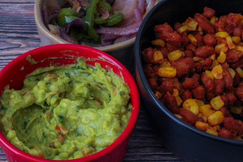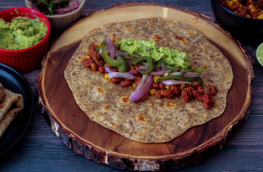 - Warm the tortilla and place it on a flat surface. Spread the desired amount of stuffing, top it with sautéed onions & capsicum and some guacamole
