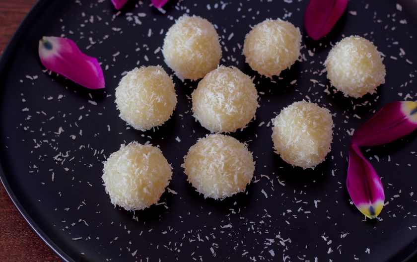 - Now grease your palm with ghee and make small round shape ladoos out of the mixture, then coat them with some more shredded coconut