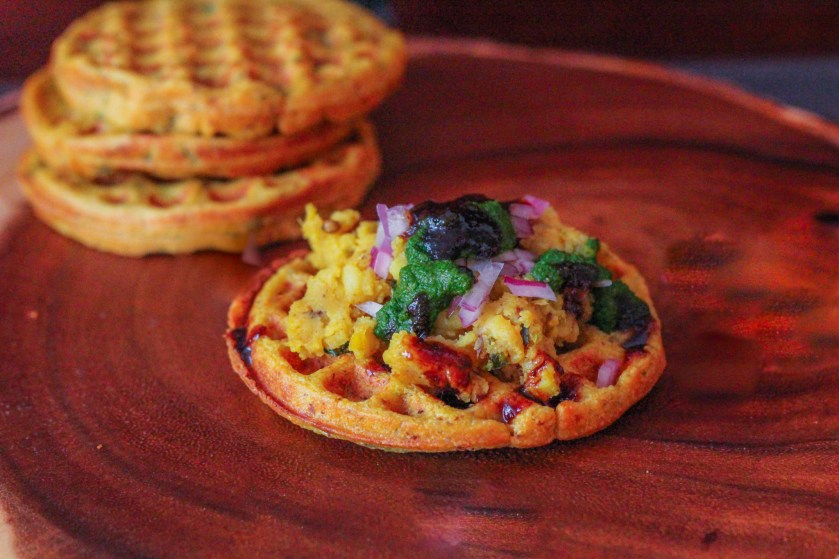 Healthy, delicious and filling!!! Waffles are made with oats flour, gram flour and a few spices. Topped with spicy samosa style potatoes, chutneys and some onions. The flavors simply fill your palate with happiness. These waffles can also be enjoyed as is with chutneys.