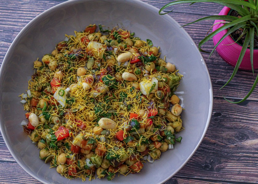 - Your Chole Chaat is ready, sprinkle some sev on top and serve!!!