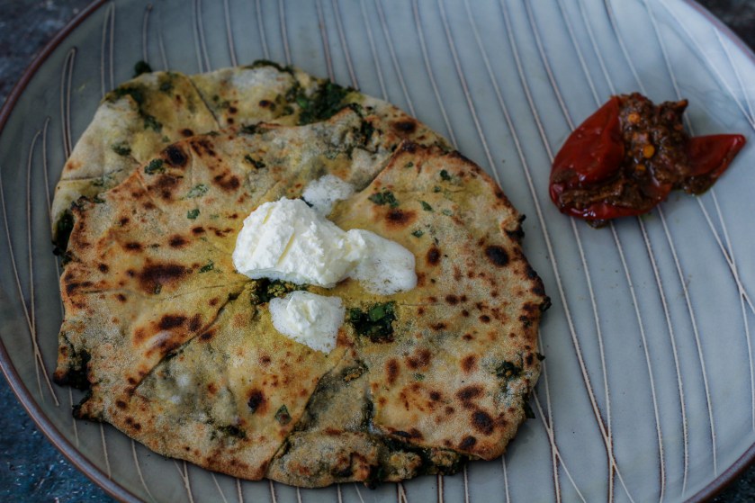A healthy and totally delicious roti to relish in the breakfast, lunch or dinner. We make a mix with fresh spinach and spices then use it as a stuffing for these rotis. Relish them with some white makhan, ghee or even regular butter.