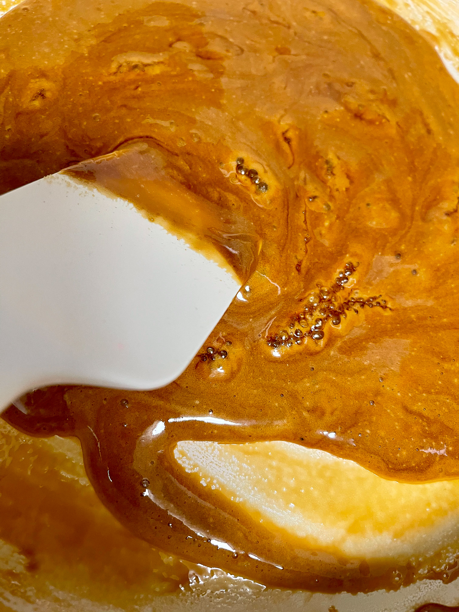 - Heat a pan, add jaggery powder and water. Mix and stir on low flame until jaggery powder melts completely. Keep cooking on low flame until it comes to a boil, then cook for about 5 mins while stirring continuously. Syrup will slightly thicken