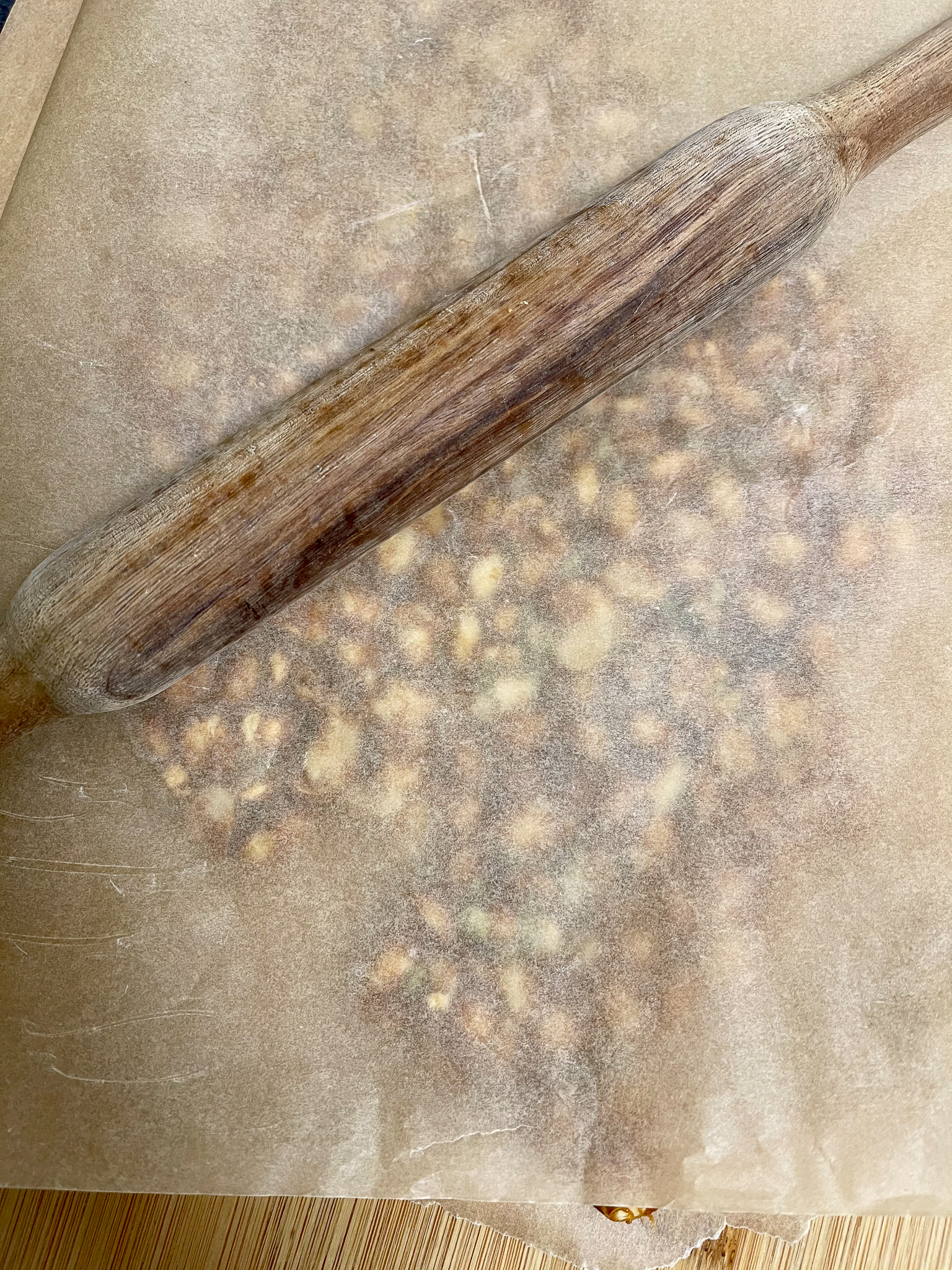 - Immediately transfer it to a tray or a cutting board lined with parchment paper, quickly sprinkle fennel seeds and place another parchment paper on the top. Roll it with a rolling pin to level it and make it as thin as possible. You can do the same thing on a greased surface and flatten the mix with a greased cup or bowl. Cut it while its warm then let it cool down completely. You have to be really quick at this step