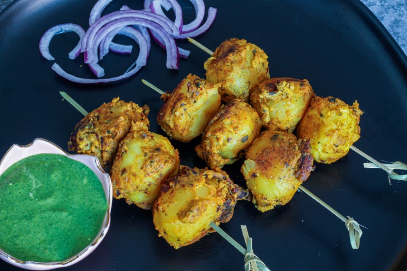 Tandoori Aloo as the name says it’s prepared in a tandoor, since we are preparing it at home we’ll be cooking them in a pan. The texture and flavors are equally good. You can also use a barbecue or air-fryer for the same. To prepare this delicious starter you’ll need boiled baby potatoes, hung curd and some spices.