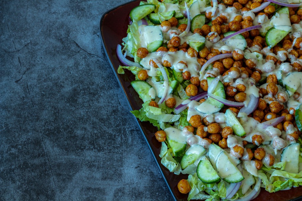- Take a serving plate or a bowl. Spread shredded lettuce, top it with sliced cucumbers, onions and crispy chickpeas, finally top it with the dressing. Serve and enjoy!!!