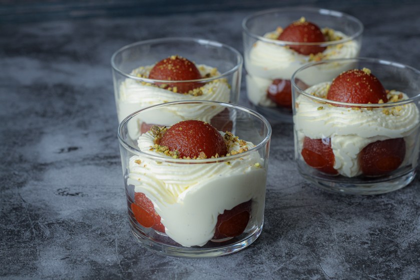 Gulab Jamun… the classic Indian dessert served with Kesar Mousse, trust me the combination is heavenly!!! You can use homemade or store-bought gulab jamuns for this recipe. Mousse is effortless to make. Do try!!!