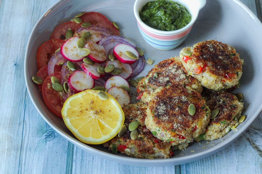 - Your Paneer Quinoa Tikkis are ready, sprinkle some chaat masala and pumpkin seeds on top and serve with green chutney, salad and lemon wedges, Enjoy!