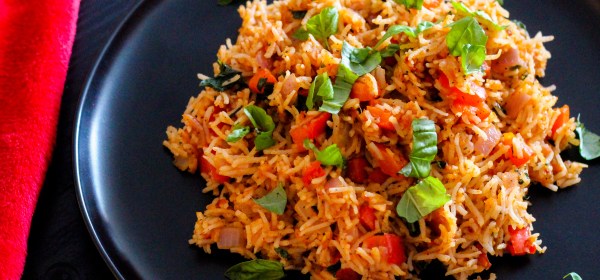 We all relish the tomato basil pasta, this is a similar recipe. Simply take out the pasta and add rice instead, there you get your