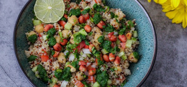 A quick and easy recipe for a nutritious salad. You’ll need boiled chickpeas, quinoa and some veggies. Roasted peanuts gives it a nice crunch and